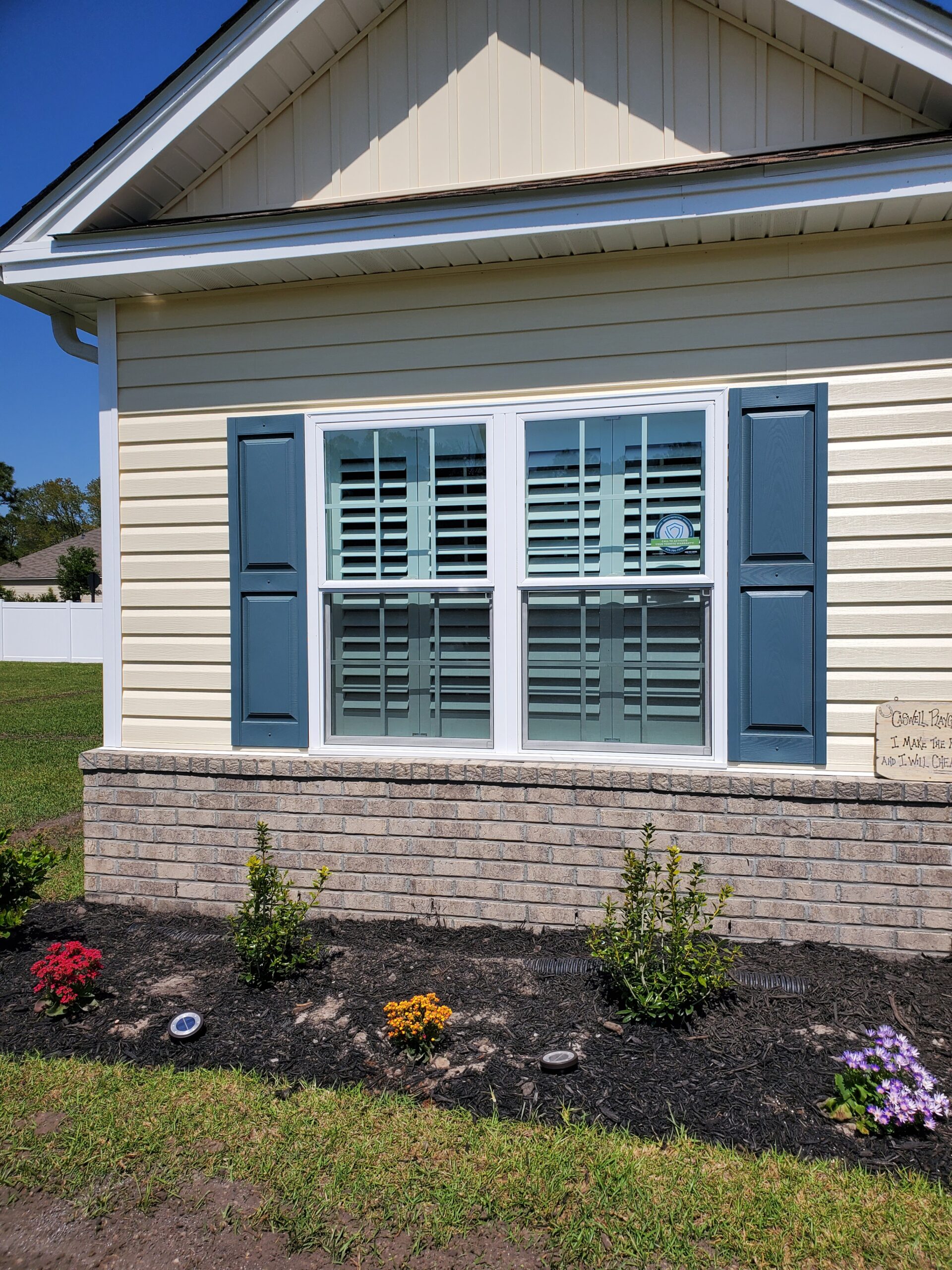 Plantation shutters on a residential window with blue shutters, surrounded by landscaped flower beds featuring colorful blooms and a brick foundation, showcasing window treatment options for home enhancement.