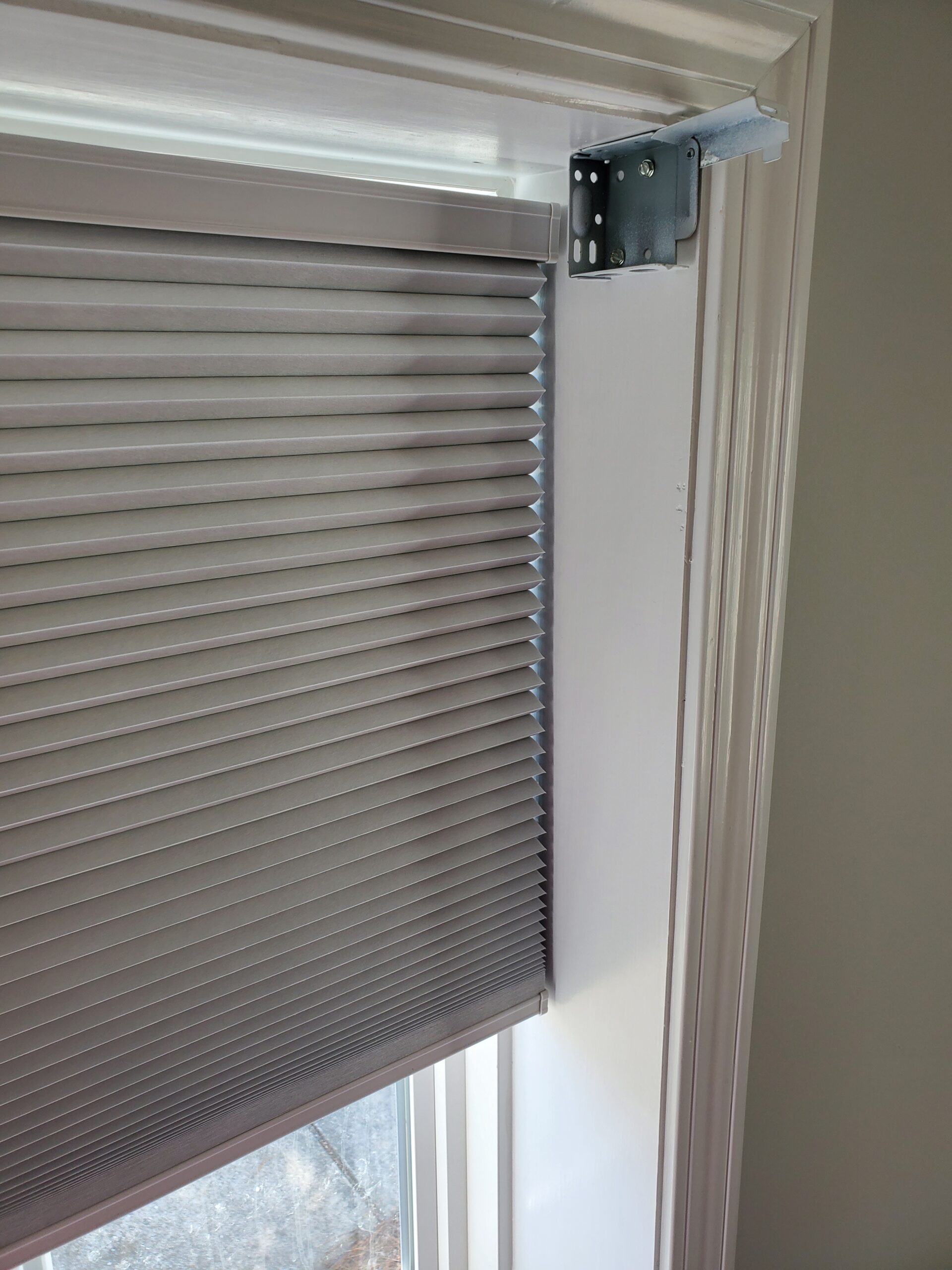 Close-up of a window with modern gray blinds installed, showcasing the hardware and clean lines, relevant to plantation shutters and window treatments offered by Plantation Shutter Pros.