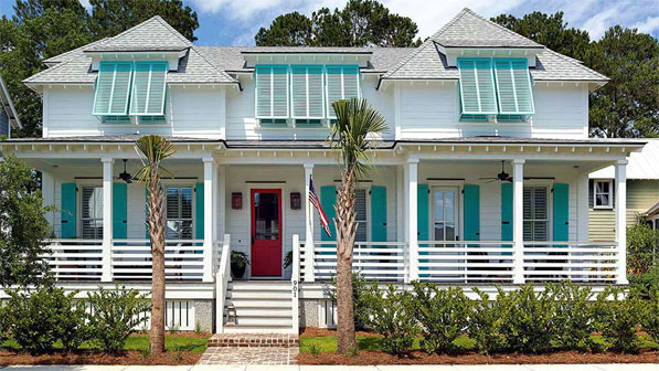 Two-story coastal-style house with Bahama shutters, palm trees, and a red front door, showcasing window treatments ideal for enhancing residential aesthetics.