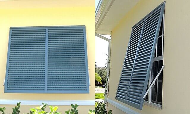 Bahama impact hurricane shutters with articulated blades installed on a beige house exterior, showcasing window protection and aesthetic appeal.