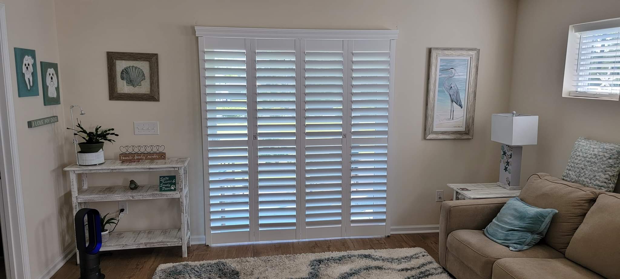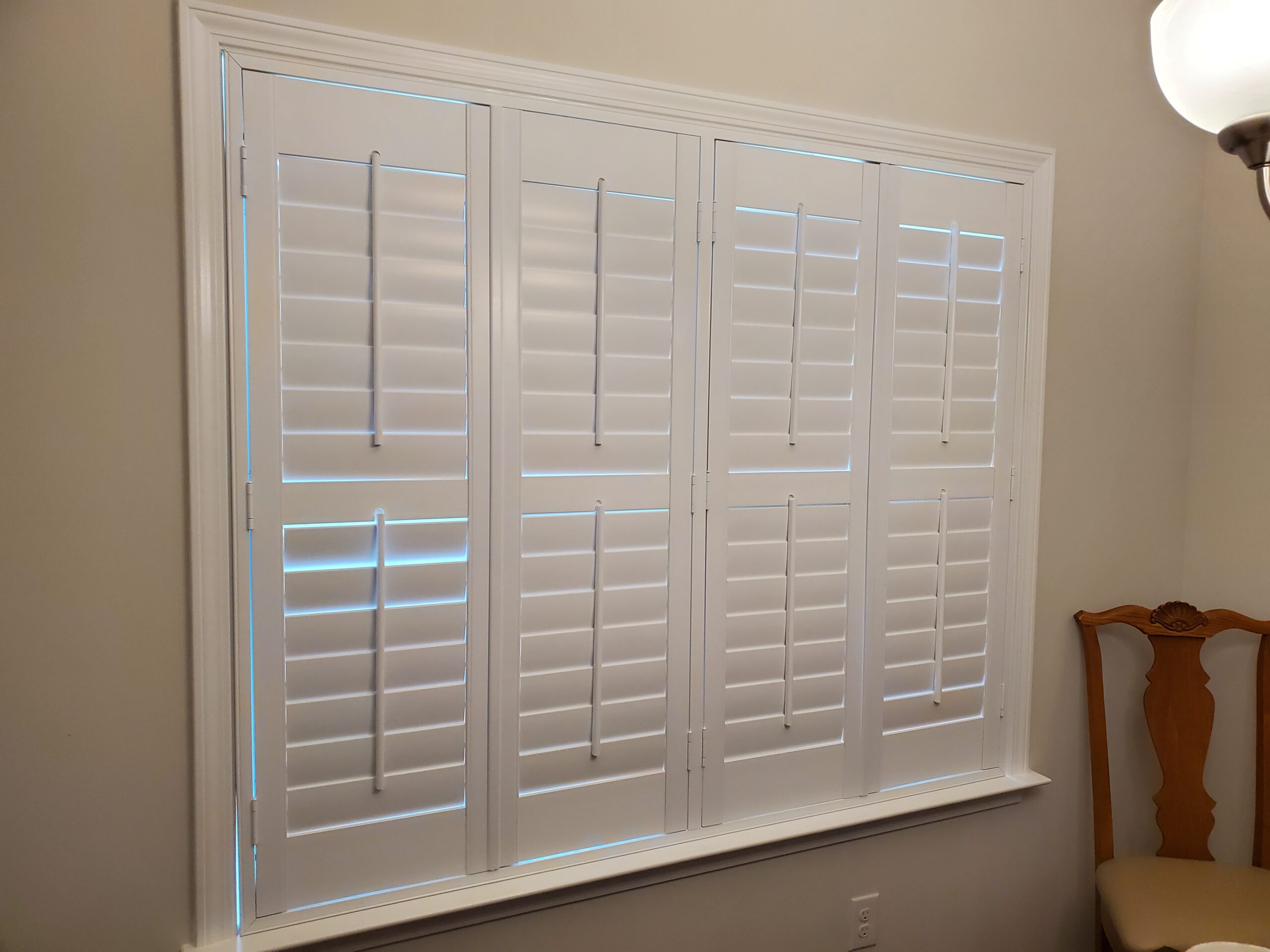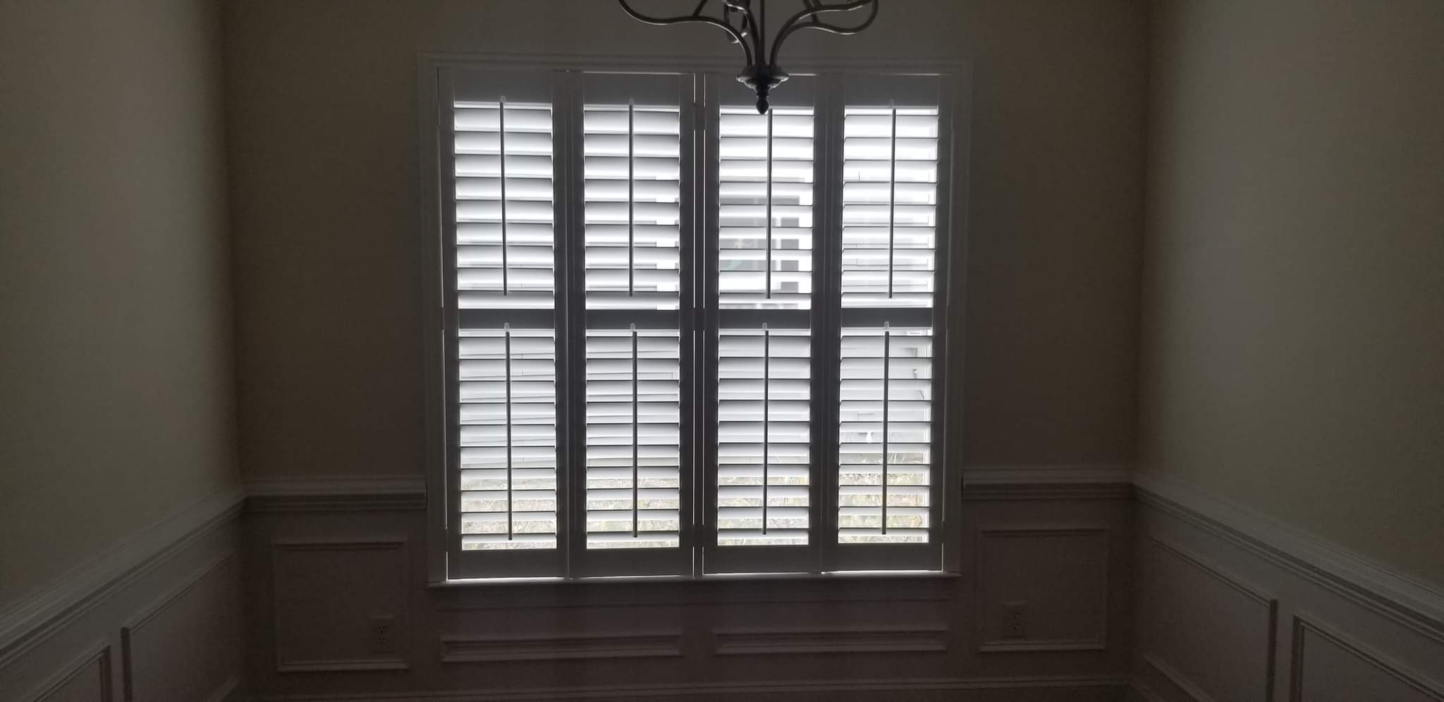 White plantation shutters installed on a window, showcasing a clean and modern design, enhancing the interior space of a home.
