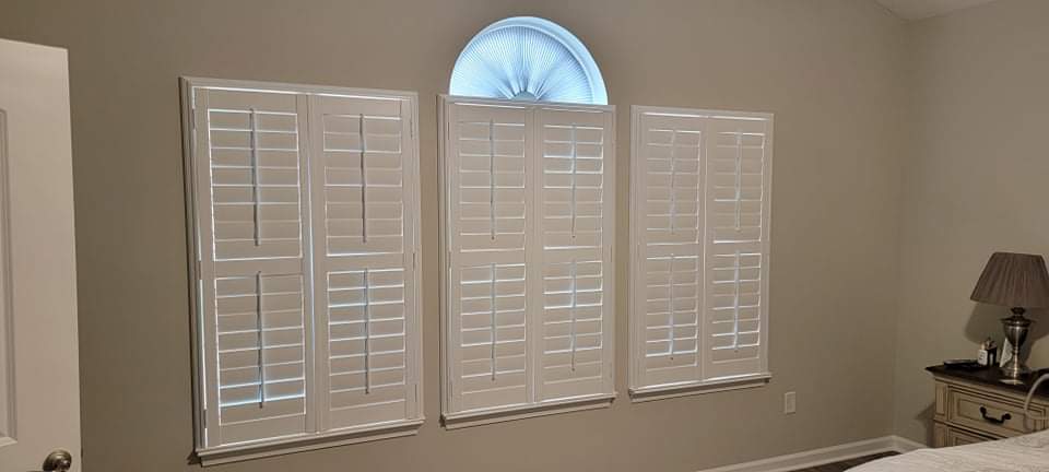 White plantation shutters with arched top, enhancing natural light in a cozy interior space, showcasing window treatment options for home aesthetics.