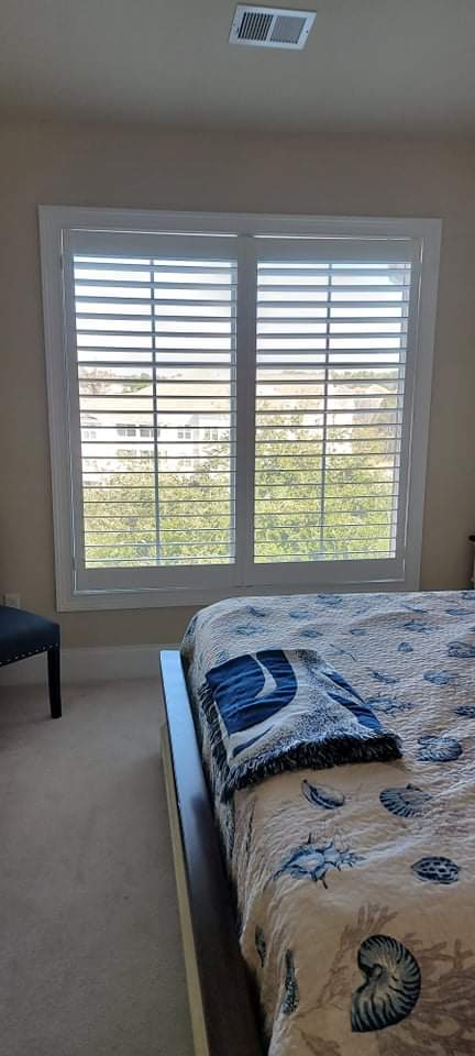 Interior bedroom featuring plantation shutters on a large window, with a bed adorned in a seashell-patterned quilt and a decorative throw, showcasing a bright, airy atmosphere.