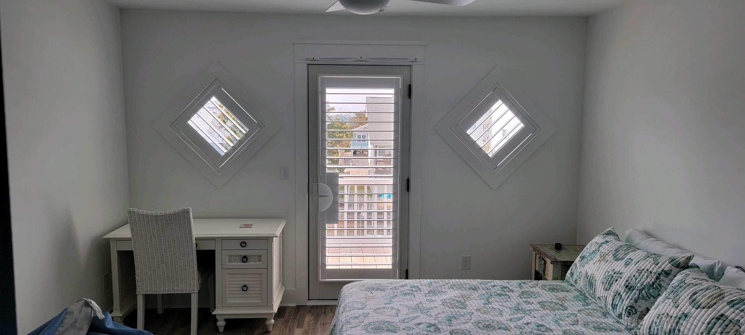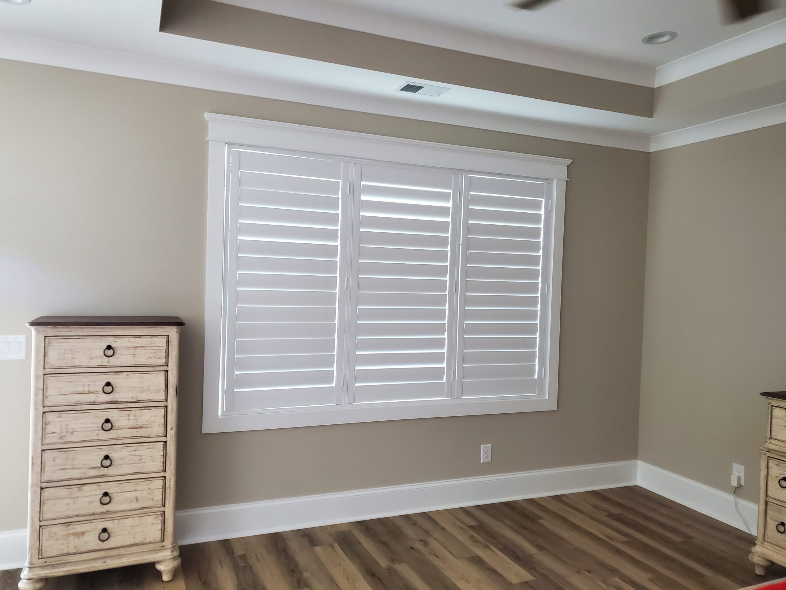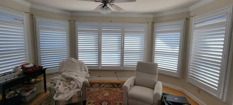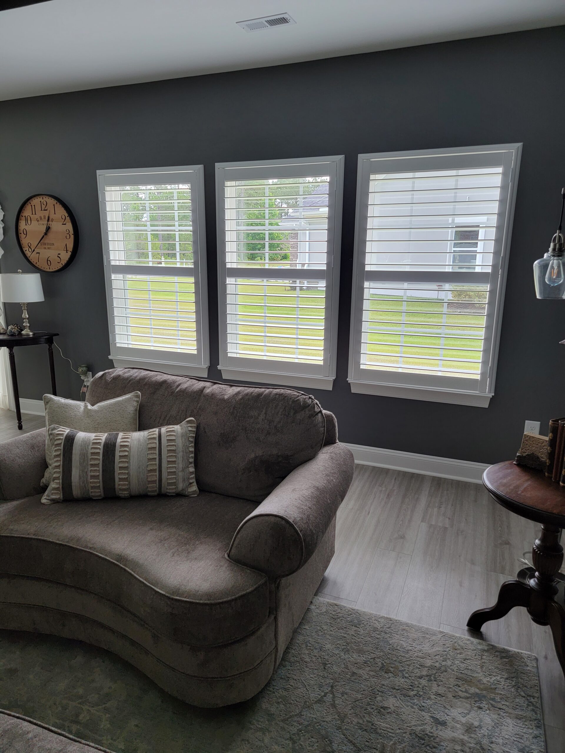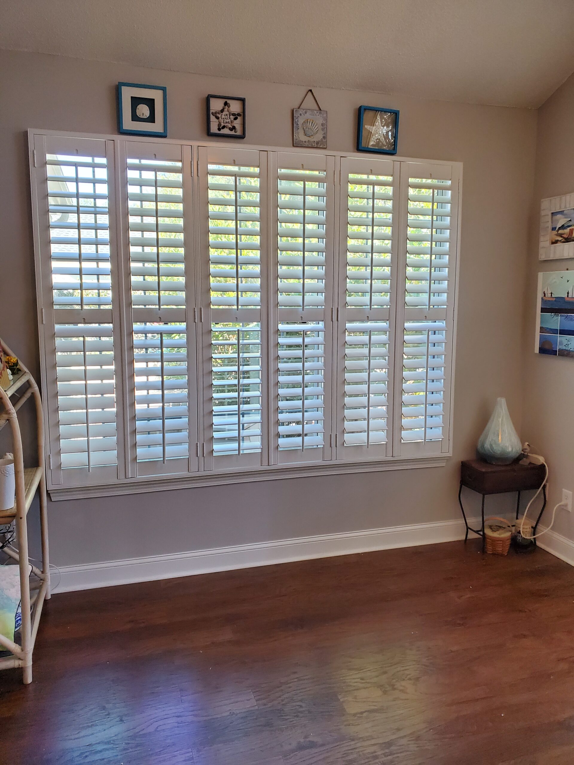 Bright room featuring plantation shutters on large windows, showcasing natural light and a cozy interior with wooden flooring and decorative elements.