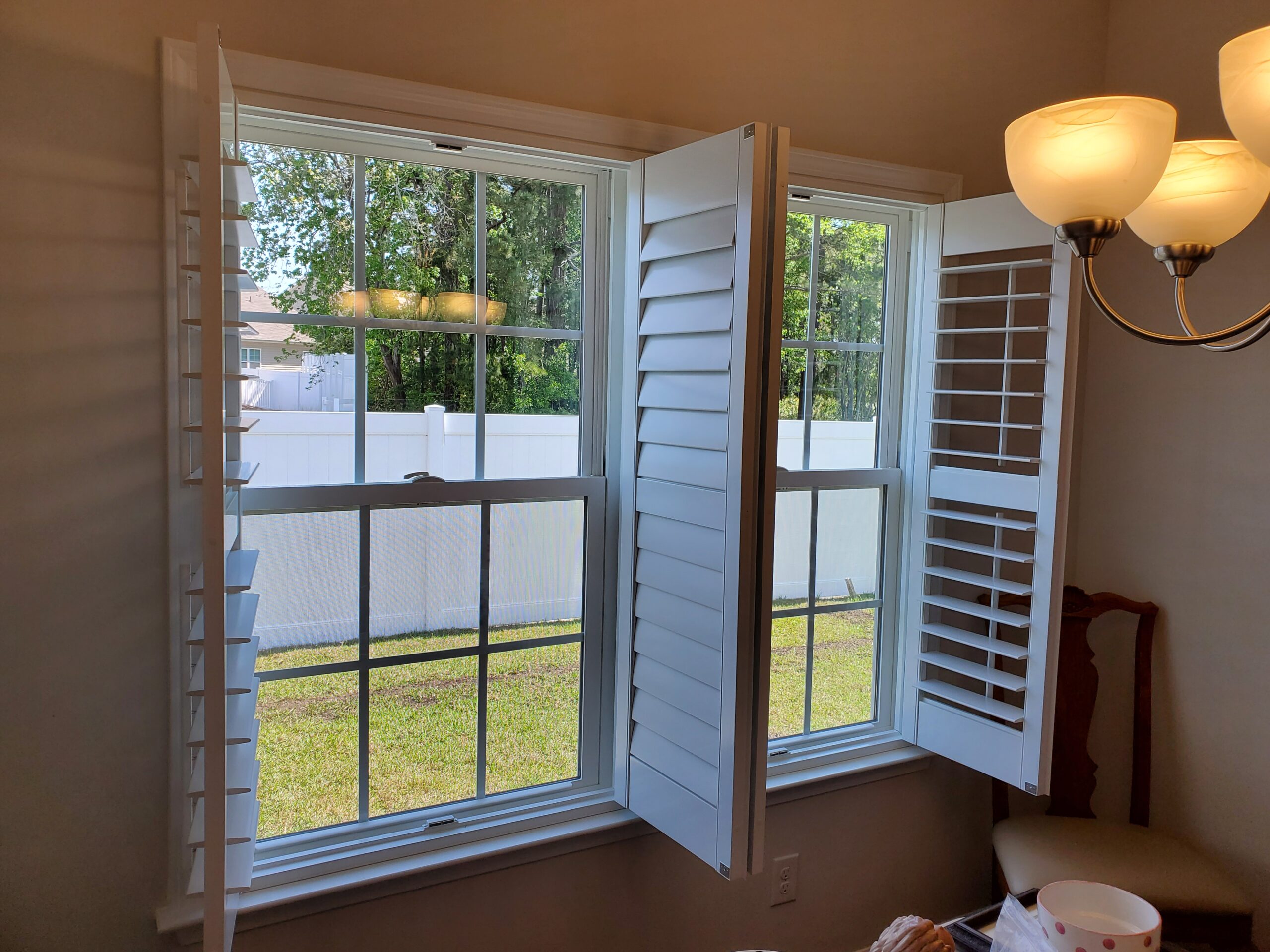 Plantation shutters installed in a window, showcasing a modern design with adjustable slats, enhancing interior aesthetics and functionality for residential spaces.