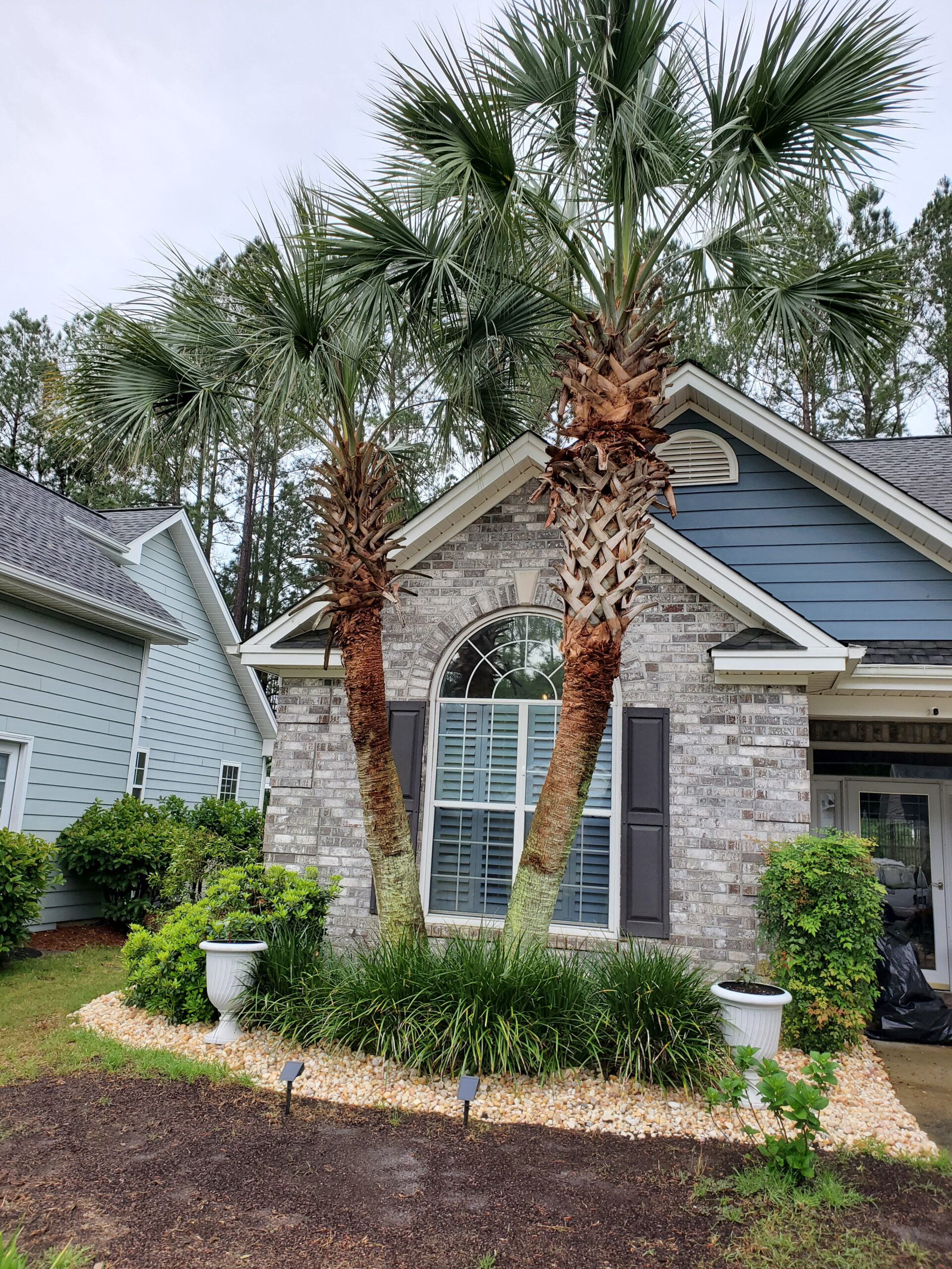 Palm trees and landscaped garden in front of a house featuring plantation shutters and brick facade, enhancing outdoor aesthetics for residential spaces.