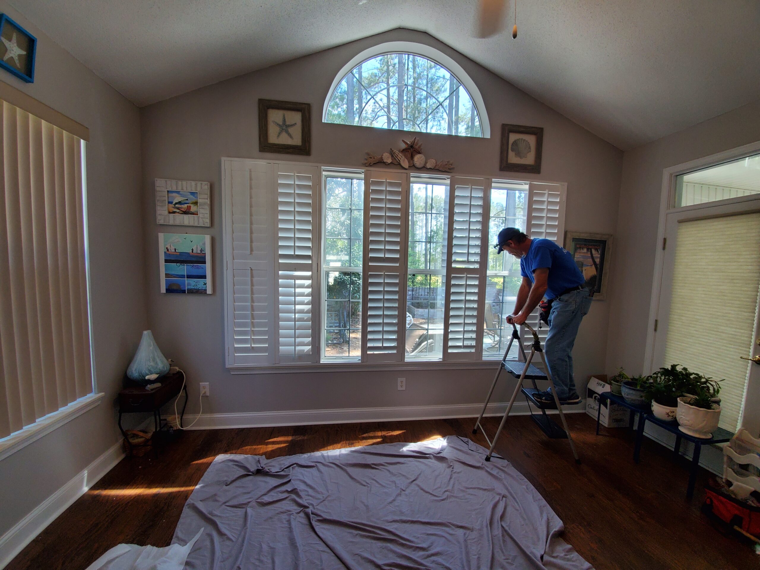 Man installing plantation shutters in a sunlit room with wooden floors, featuring decorative wall art and a cozy atmosphere.