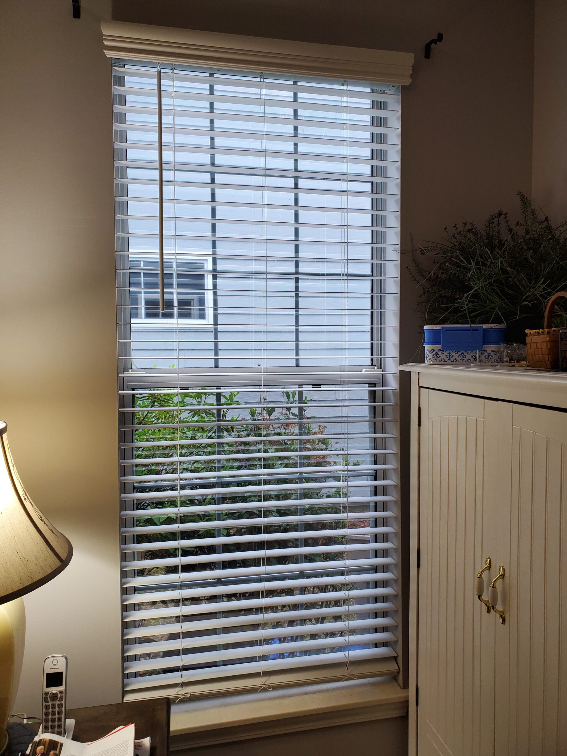 Interior view of window with faux wood blinds, showcasing greenery outside, highlighting window treatment options for home aesthetics.