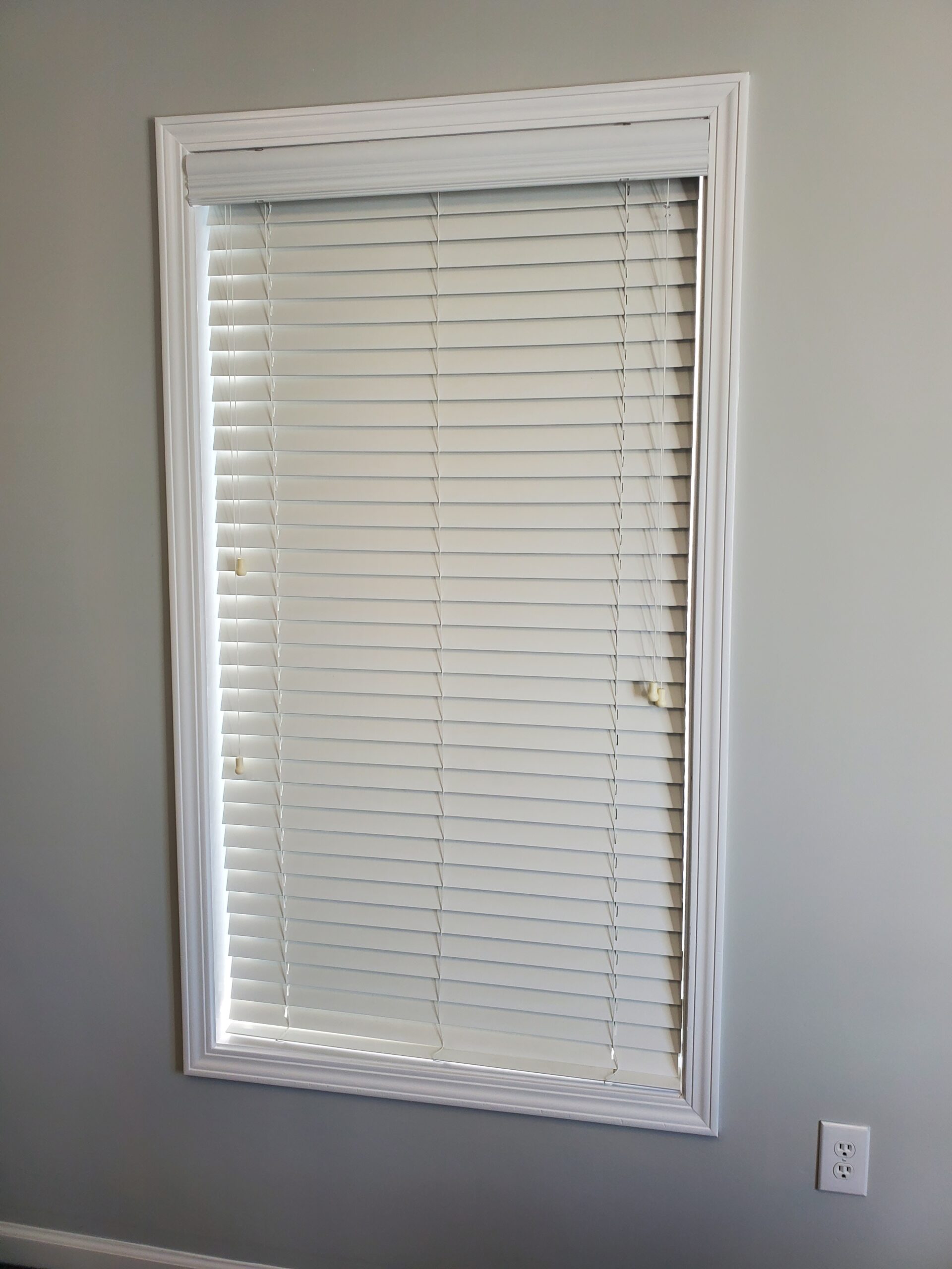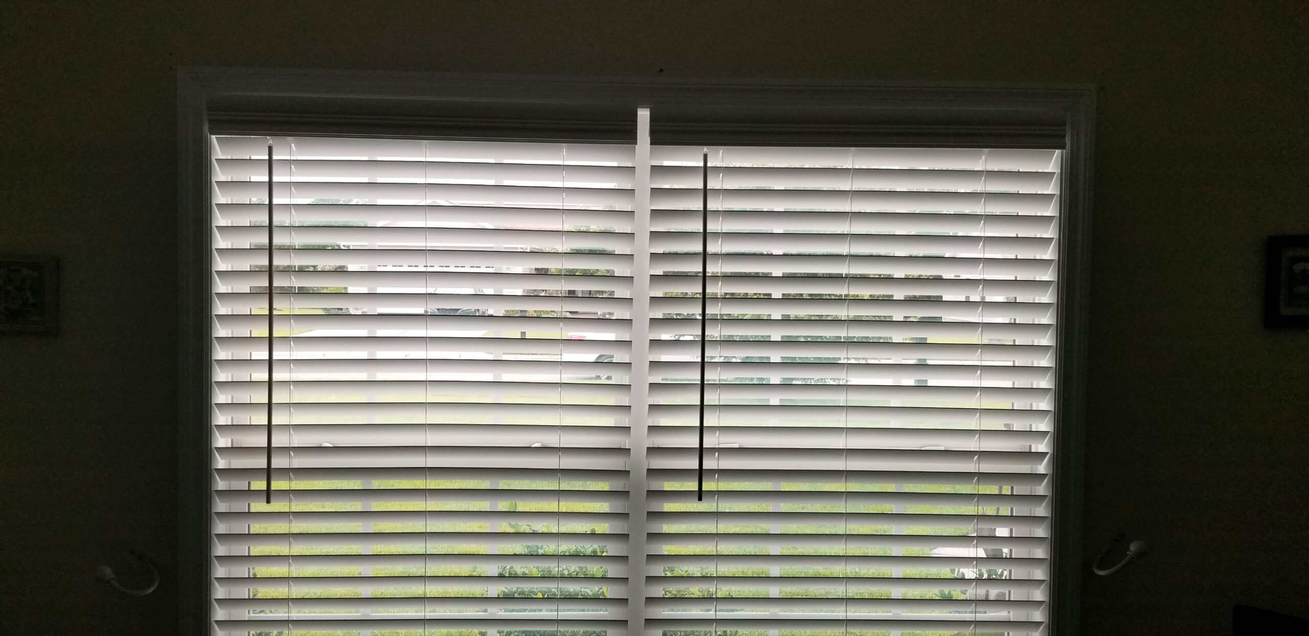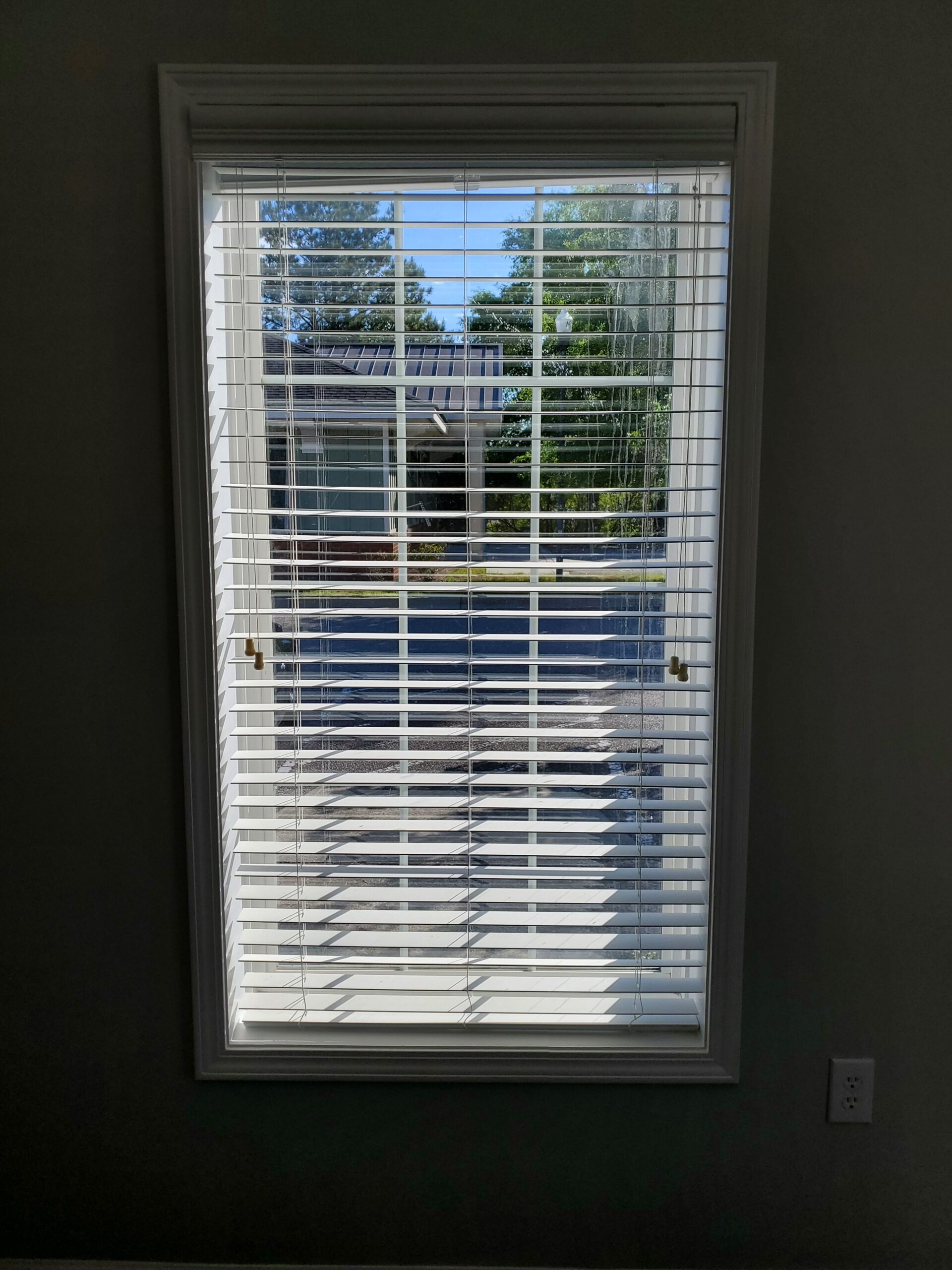 White faux wood blinds installed in a window frame, enhancing interior aesthetics and light control, relevant to window treatment options from Plantation Shutter Pros.