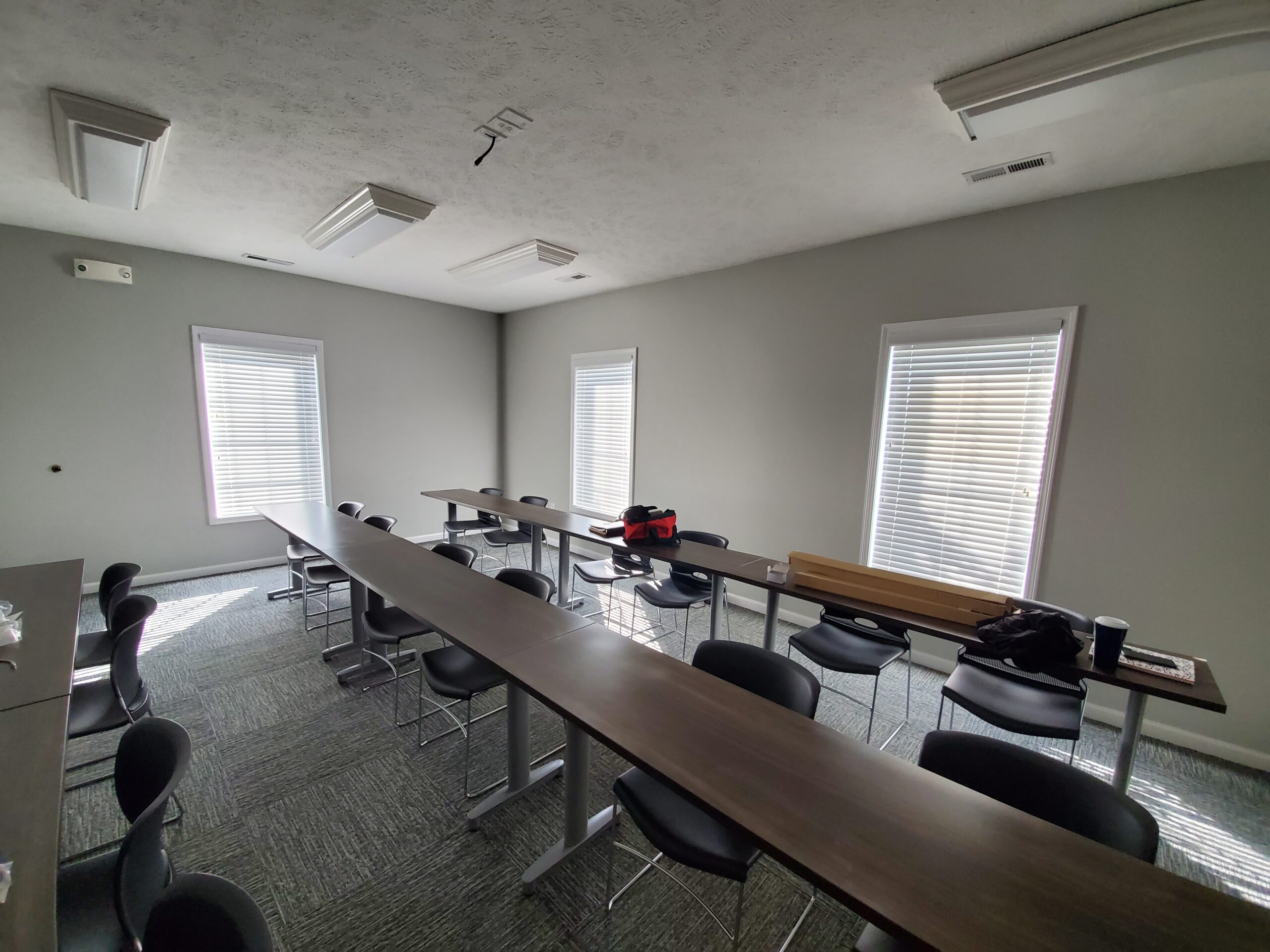 Interior view of a meeting room featuring multiple tables and chairs, with natural light streaming through window treatments, showcasing plantation shutters.