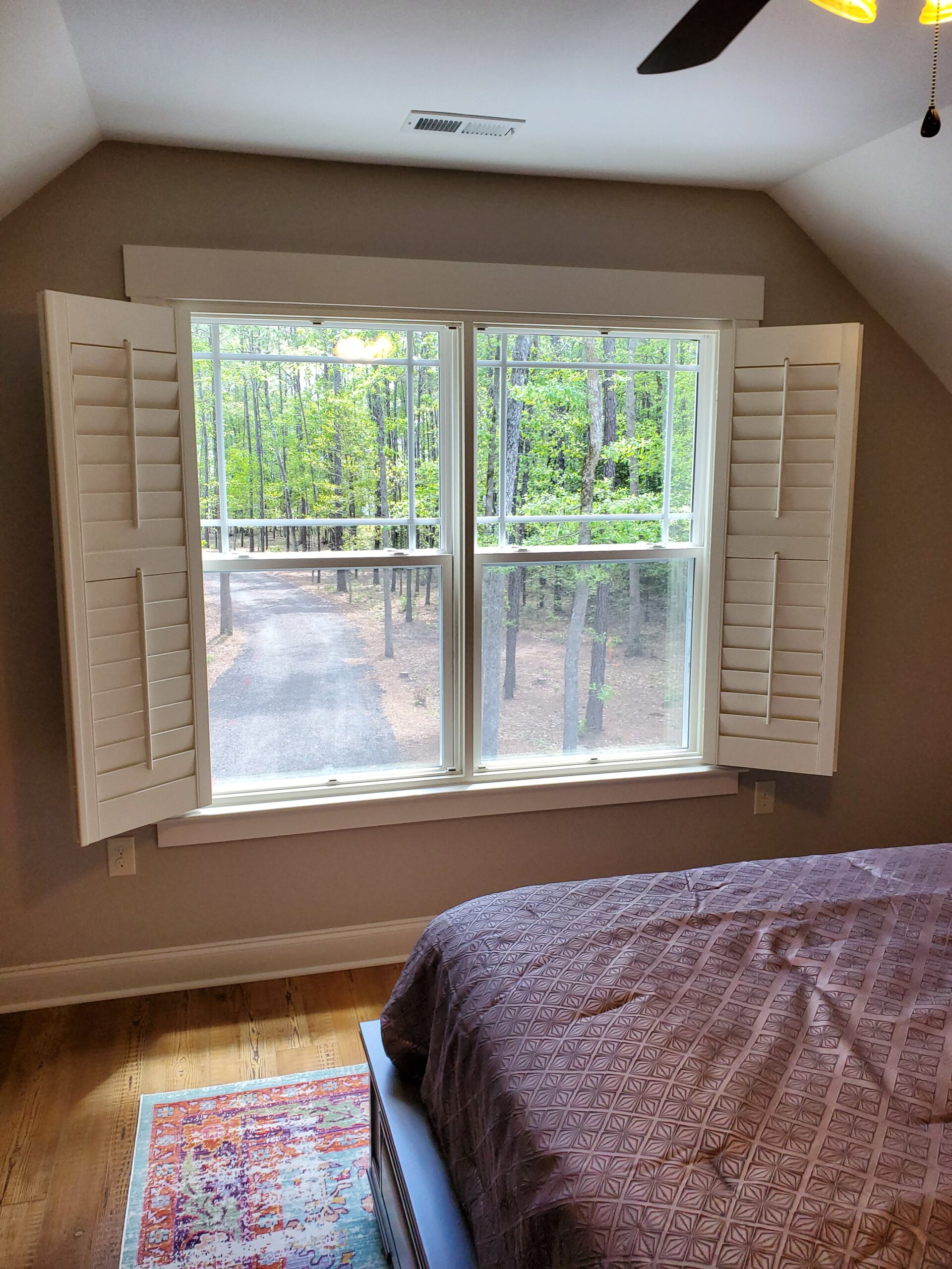 Window featuring hybrid plantation shutters in a cozy bedroom, overlooking a wooded area and a gravel path, enhancing natural light and aesthetics.