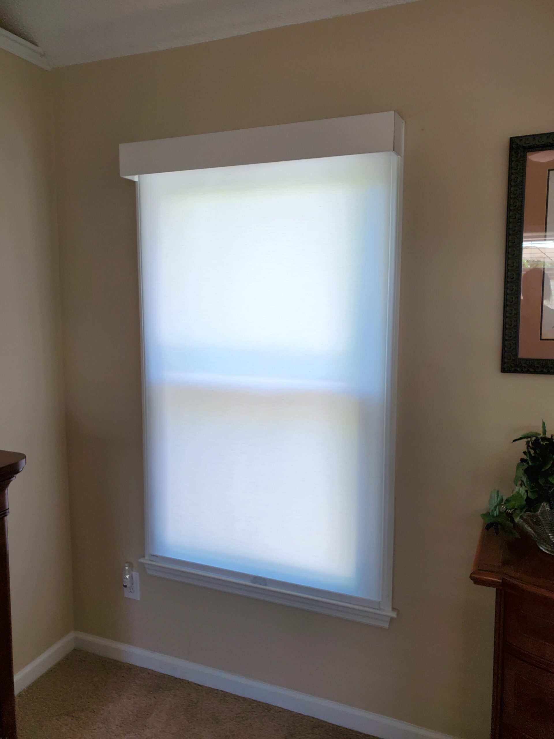 Window with sheer roller shade in a cozy room, showcasing modern window treatment options from Plantation Shutter Pros.