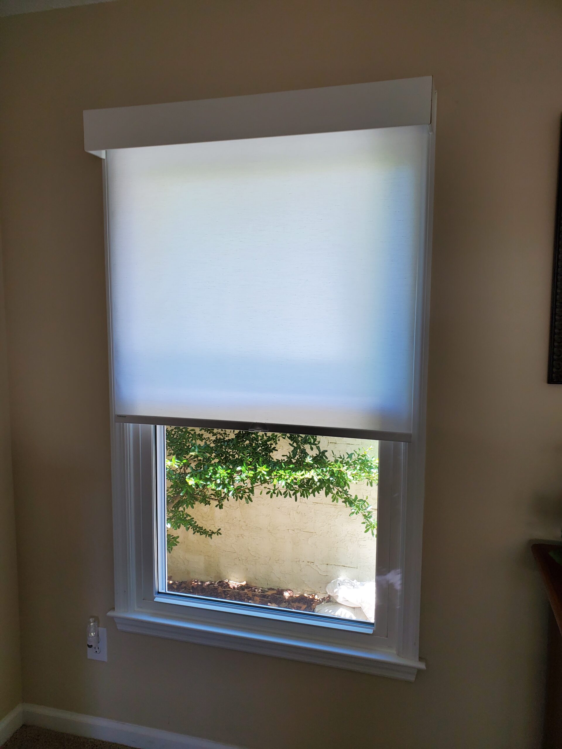 Window with light-filtering roller shade, framed by white trim, showcasing greenery outside, illustrating modern window treatment options by Plantation Shutter Pros.