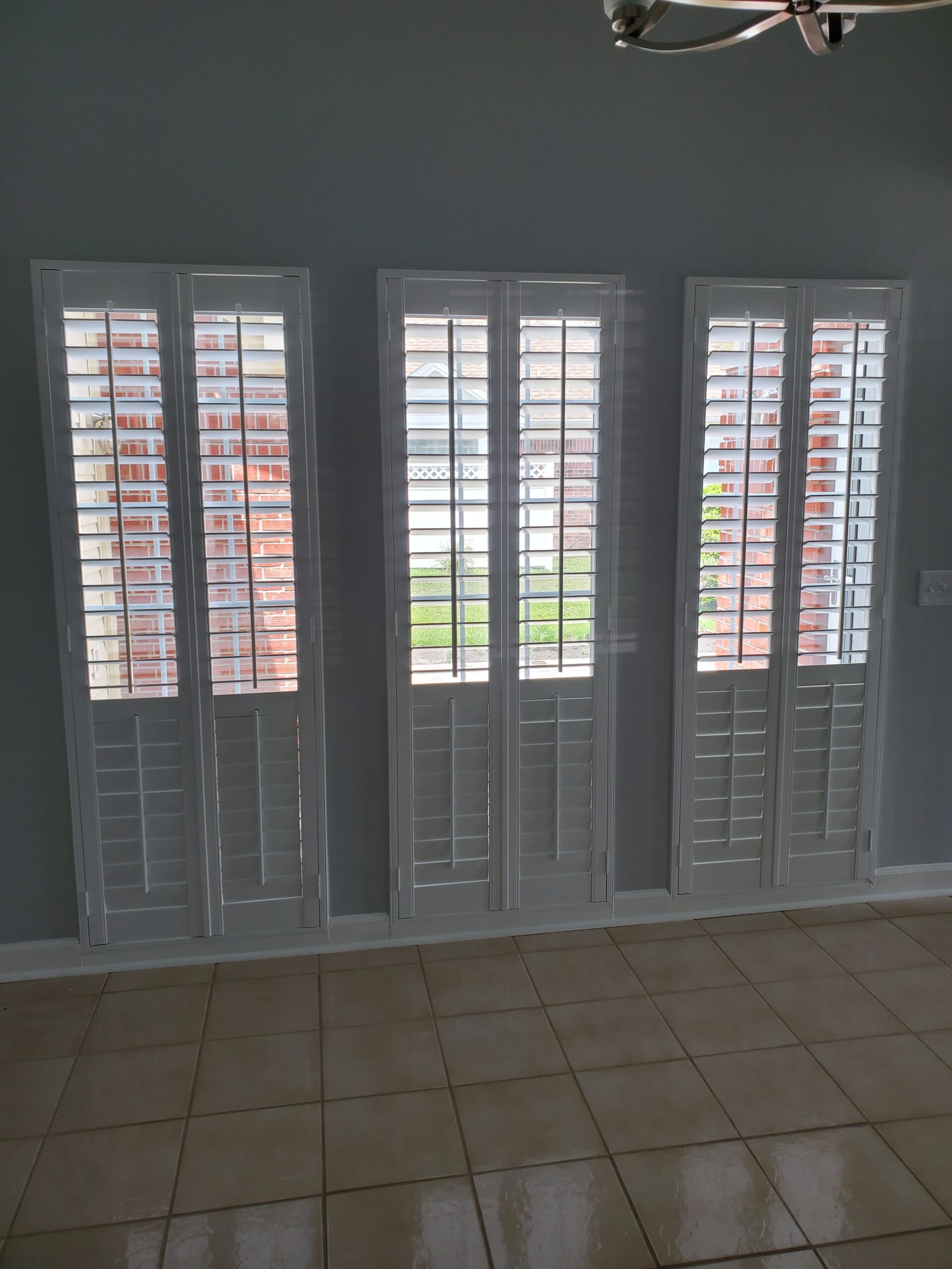 Three white plantation shutters installed on a light gray wall, showcasing a modern window treatment design for enhancing residential spaces.
