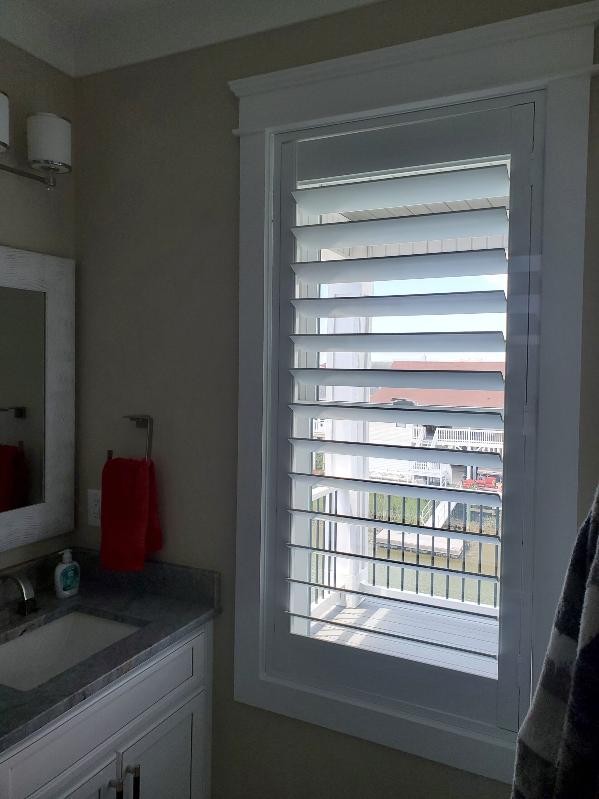 Bathroom window featuring hybrid plantation shutters, allowing natural light, with a view of a deck and water, complemented by a modern sink and red towel.