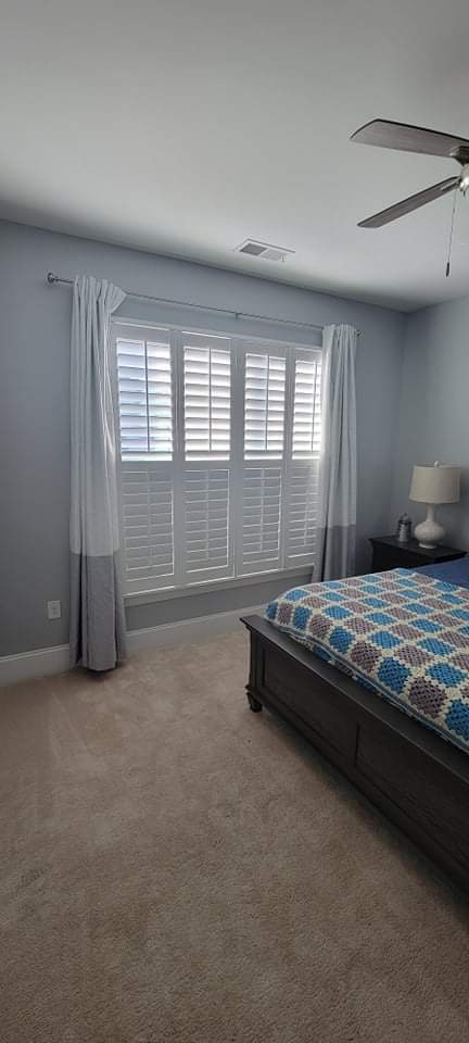 Bedroom featuring hybrid plantation shutters on windows, a decorative mirror, acoustic guitar, and cozy furnishings, showcasing stylish window treatments for enhancing home aesthetics.