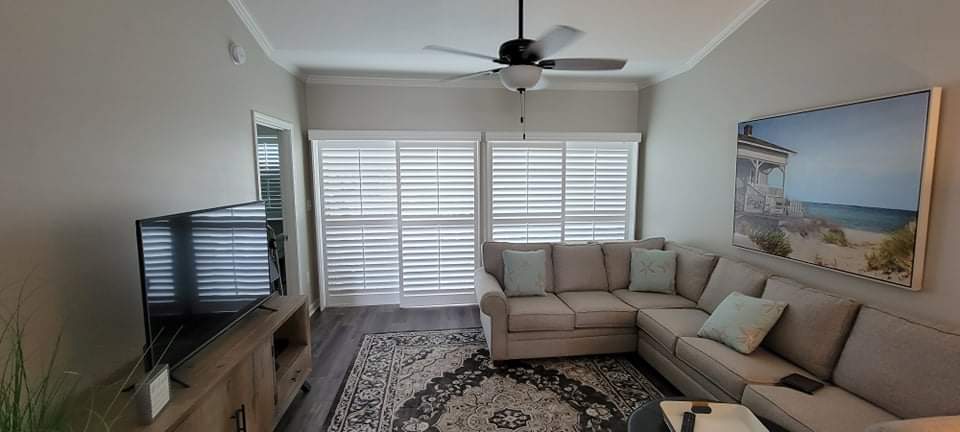 Living room featuring plantation shutters on windows, a ceiling fan, beige walls, and a cozy seating arrangement with decorative pillows and a wooden coffee table.