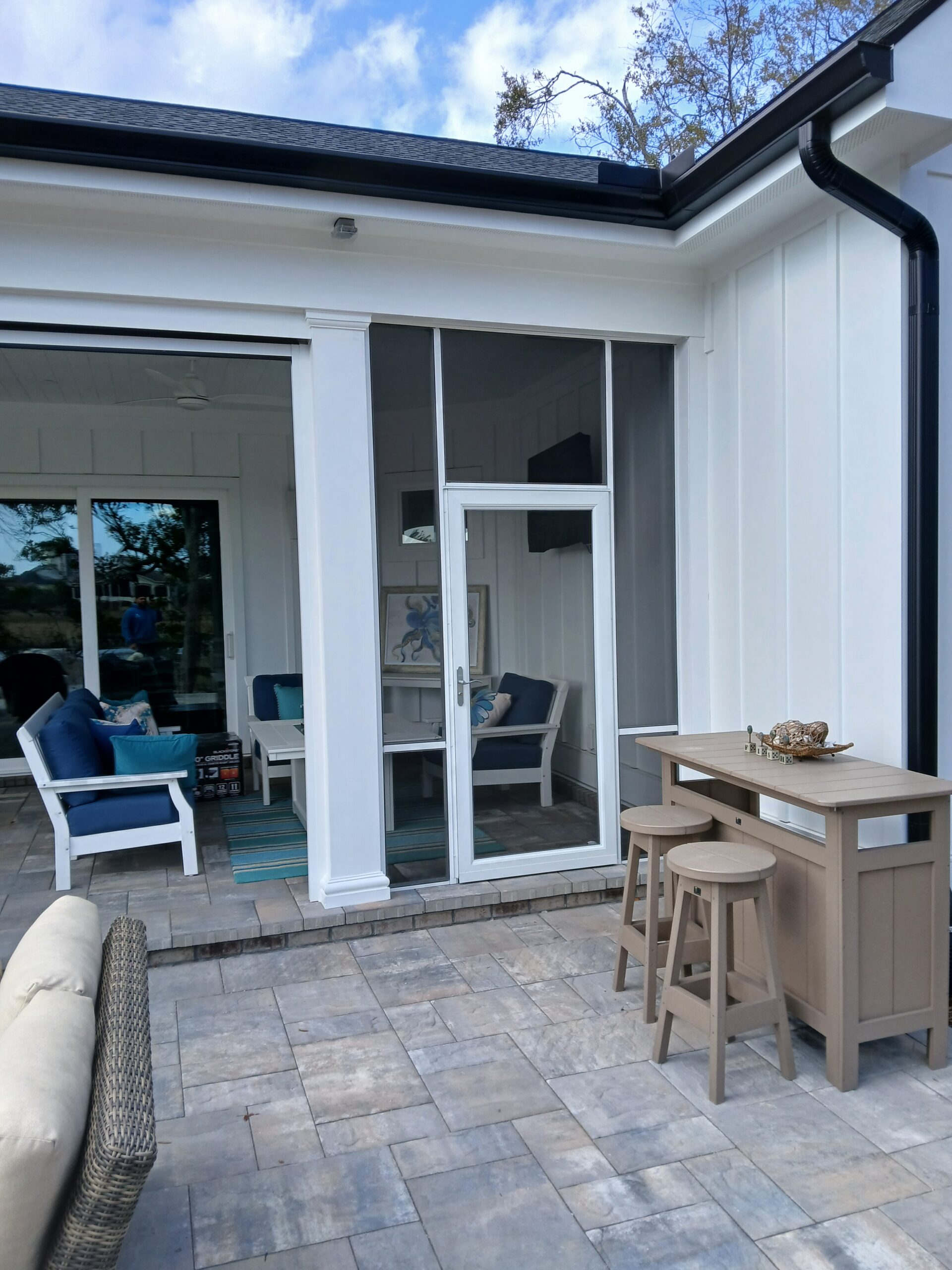 Outdoor living space featuring a screened porch with blue seating, a light-colored bar table, and stools on stone flooring, showcasing window treatment options for enhancing home aesthetics.