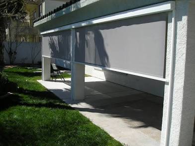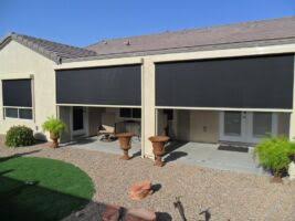 Exterior solar shades installed on a residential patio, enhancing outdoor space aesthetics and functionality, with a focus on window treatment solutions.