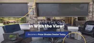Outdoor space featuring modern solar shades, stylish patio furniture, and a promotional message for Polar Shades, emphasizing improved views and dealer opportunities.