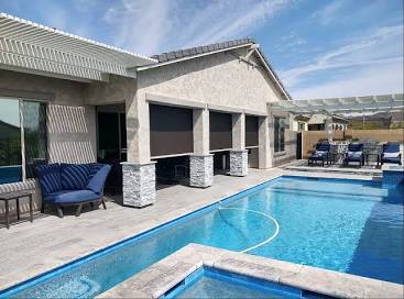 Modern outdoor living space featuring a pool, lounge chairs, and exterior solar shades on a house, showcasing stylish window treatment options for enhancing residential aesthetics.